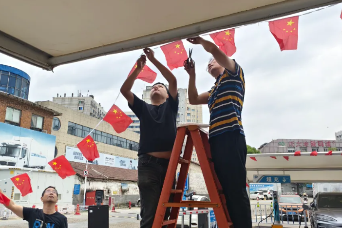 9月25日,在物業(yè)經(jīng)營分公司停車場內,一面面嶄新的五星紅旗被整齊懸掛充電站及停車場出入口顯眼位置,鮮紅的旗